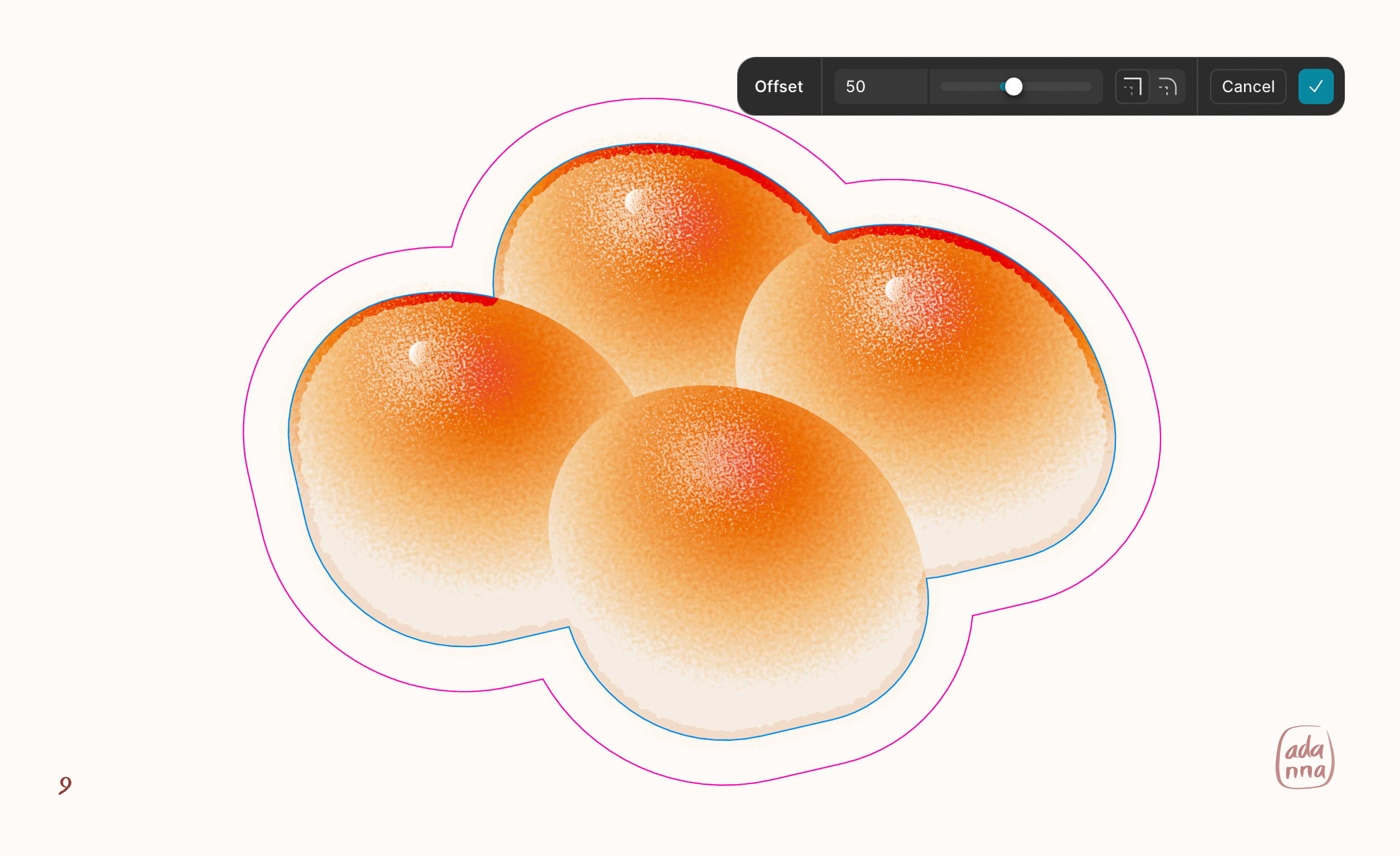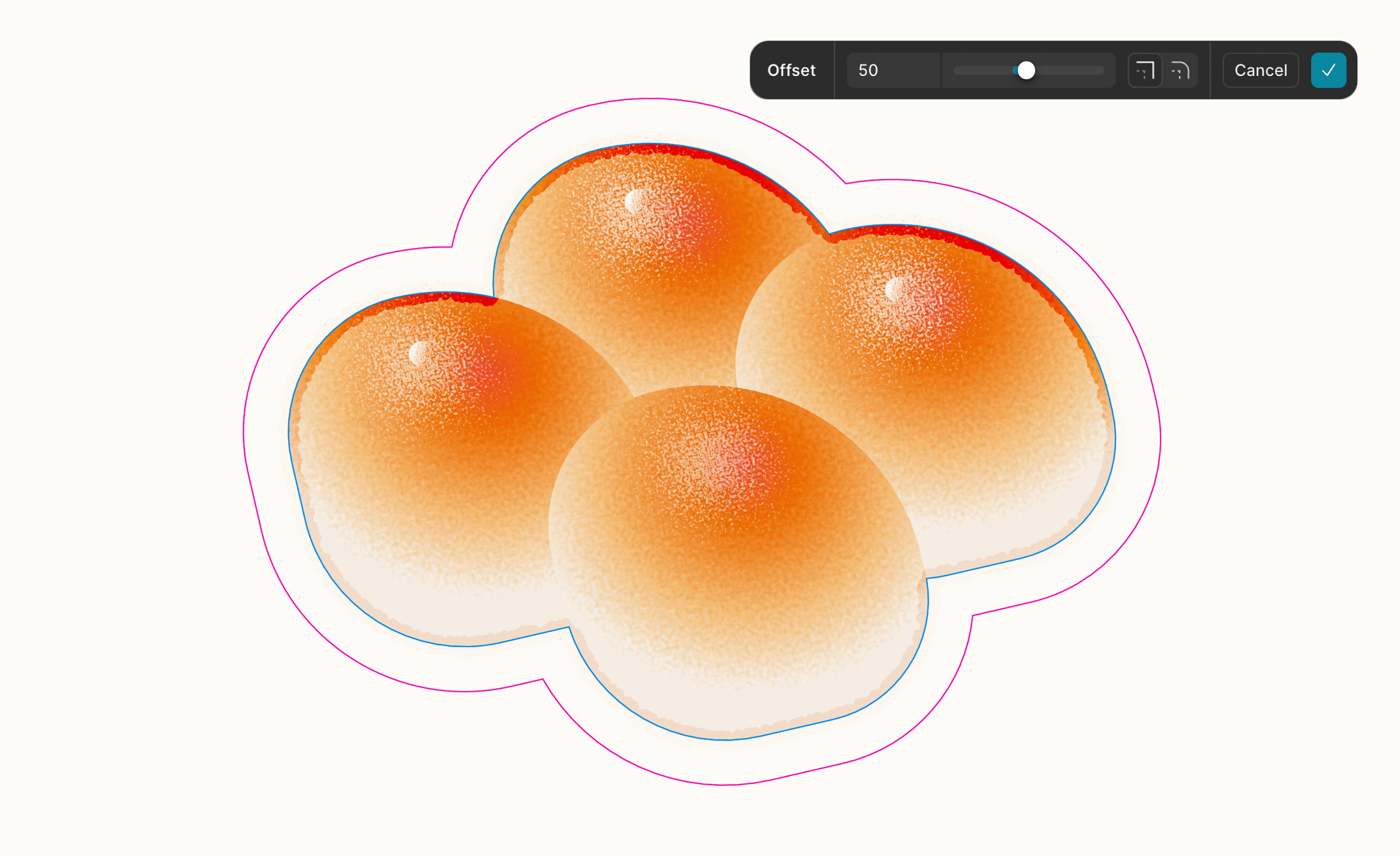 Make copies of the buns and Union the copies into a single shape. Next, flatten that shape and add a dark red stroke. Remove the fill (if there is one) and set the dark red stroke to Overlay.
